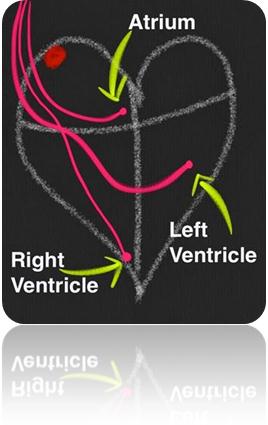 into the right atrium and on to the right ventricle. The biventricular pacemaker travels the same route,